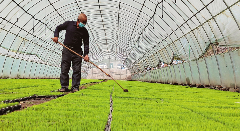 5月14日,太原市晉源區(qū)花塔村育秧基地村民正在護理秧苗。眼下正是農(nóng)忙時節(jié),晉源區(qū)在去年花塔村自動育秧基地的基礎(chǔ)上,新擴建王郭村、北大寺村、稻花城3個育秧基地,優(yōu)選新稻種,擦亮區(qū)域性特色農(nóng)產(chǎn)品品牌。當(dāng)?shù)赜行蚪M織村民推進育秧、整地等,滿足全區(qū)3300畝晉祠水稻的插秧需求。(記者李兆民攝)