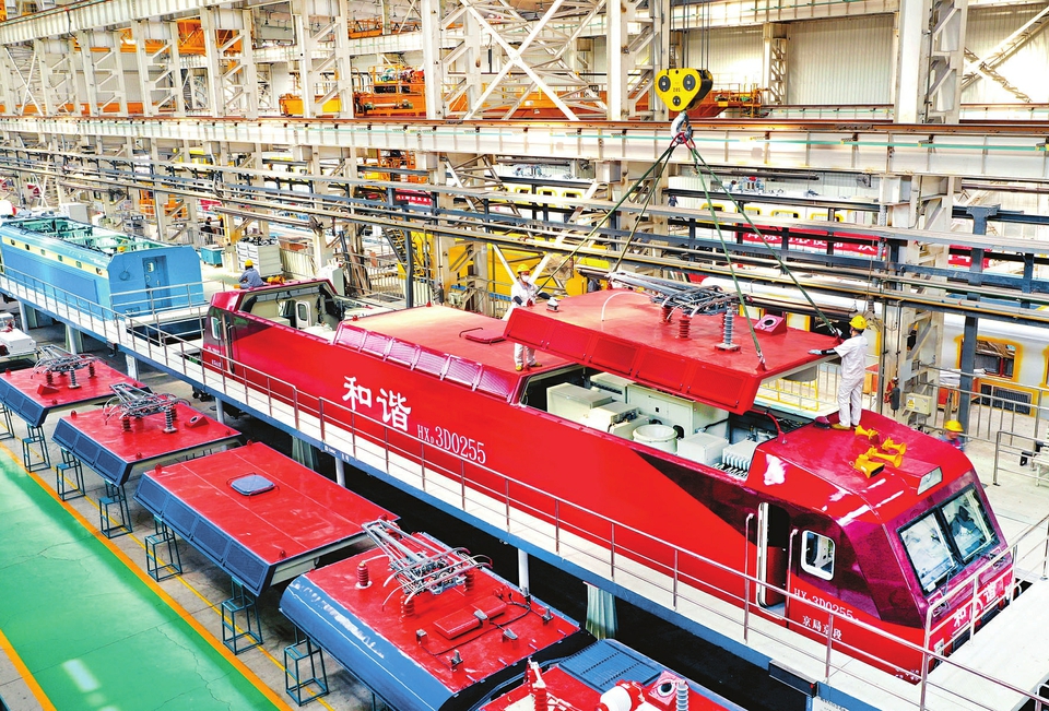 5月20日,在中車太原公司和諧型機(jī)車總組裝生產(chǎn)線,工人們正在吊裝電力機(jī)車頂蓋。今年以來,中車太原公司克服疫情對(duì)生產(chǎn)的影響,強(qiáng)化跟蹤工序進(jìn)度,全面排查整治安全質(zhì)量薄弱環(huán)節(jié),確保各個(gè)工序安全高效、工藝質(zhì)量可靠。目前,公司已實(shí)現(xiàn)電力機(jī)車檢修產(chǎn)品交直流并舉的重大跨越。(記者劉通攝)