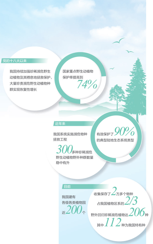 近年來,我國系統(tǒng)實施瀕危物種拯救工程,采取就地保護、遷地保護、放歸(回歸)自然、人工繁育(培植)等措施,有效保護了90%的典型陸地生態(tài)系統(tǒng)類型,300多種珍稀瀕危野生動植物野外種群數(shù)量穩(wěn)中有升。目前,我國建有各級各類植物園近200個,收集保存了2萬多個物種,占我國植物區(qū)系的2/3。野外回歸珍稀瀕危植物達(dá)到206種,其中112種為我國特有種。麋鹿、普氏野馬曾一度在野外消失,目前通過人工繁育等方式,總數(shù)分別達(dá)近1萬只和700只左右,并成功實施放歸自然,重新建立了野外種群,生存區(qū)域和范圍不斷擴大。
