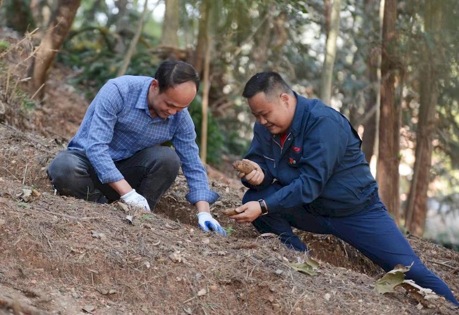 俞海奎(右一)正在指導農(nóng)戶種植天麻。龔旭東供圖