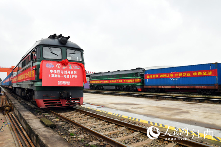2月19日,2022年江西省首列中俄雙向?qū)﹂_班列(南昌—莫斯科)在南昌向塘國際陸港成功到發(fā)?!皩﹂_班列”的開行將大大提高集裝箱周轉(zhuǎn)效率,降低企業(yè)運輸成本。 人民網(wǎng) 時雨攝