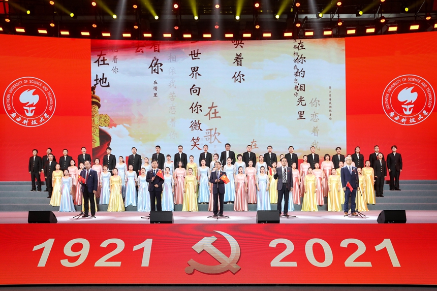 南科大校長薛其坤與院士代表、師生代表齊唱《共和國之戀》。南科大供圖