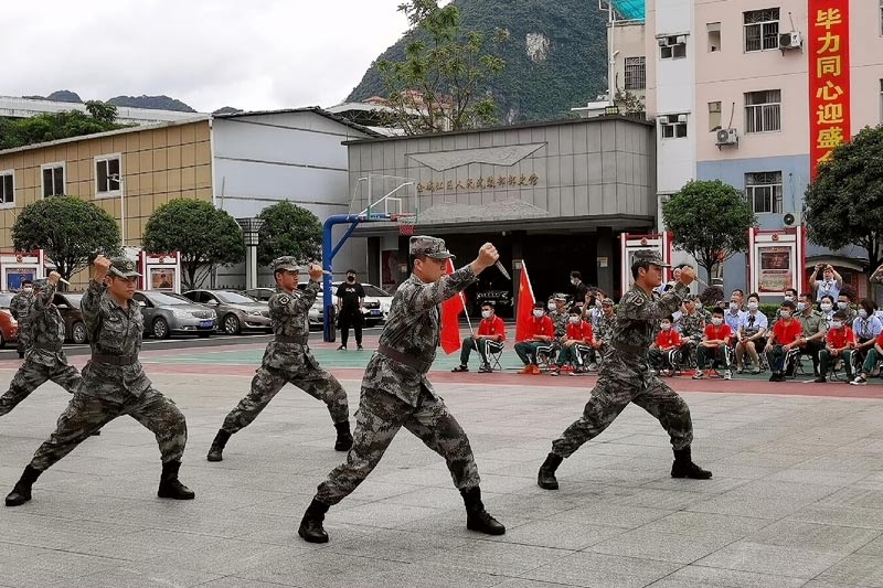 官兵為師生們表演軍體拳。高東風(fēng)攝