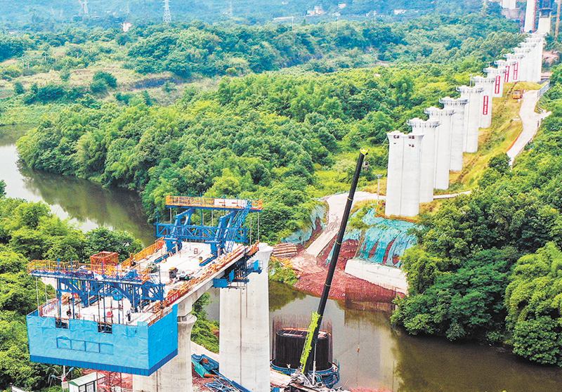近日,西部(重慶)科學(xué)城巴福鎮(zhèn),渝昆高鐵川渝段三百梯水庫道岔特大橋施工現(xiàn)場一片繁忙。