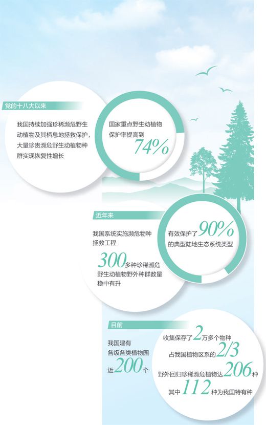 近年來(lái),我國(guó)系統(tǒng)實(shí)施瀕危物種拯救工程,采取就地保護(hù)、遷地保護(hù)、放歸(回歸)自然、人工繁育(培植)等措施,有效保護(hù)了90%的典型陸地生態(tài)系統(tǒng)類型,300多種珍稀瀕危野生動(dòng)植物野外種群數(shù)量穩(wěn)中有升。目前,我國(guó)建有各級(jí)各類植物園近200個(gè),收集保存了2萬(wàn)多個(gè)物種,占我國(guó)植物區(qū)系的2/3。野外回歸珍稀瀕危植物達(dá)到206種,其中112種為我國(guó)特有種。麋鹿、普氏野馬曾一度在野外消失,目前通過(guò)人工繁育等方式,總數(shù)分別達(dá)近1萬(wàn)只和700只左右,并成功實(shí)施放歸自然,重新建立了野外種群,生存區(qū)域和范圍不斷擴(kuò)大。