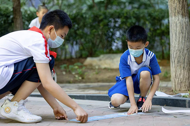 陶然亭街道大吉巷社區(qū)的一處核酸點(diǎn)位上,兩米線安全提示標(biāo)識(shí)引起大伙兒注意?!氨苊饩奂?,嚴(yán)防疫情”“綠色出行,愛心助考”“文明陪考,安全第一”……誰能想到這些醒目的標(biāo)語竟然是“陶然娃”們想的“愛心助考公約”?!榜R上就是高考了,希望哥哥姐姐們能取得好成績(jī),不辜負(fù)自己多年的努力?!?3歲的陳博一趴在地上,奮力的拍了拍自己剛剛貼好的“公約宣傳條”。
