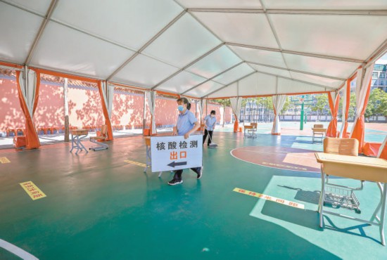 用紅色遮陽(yáng)棚搭建在操場(chǎng)上的室外休息區(qū),下午考試結(jié)束后將變身核酸檢測(cè)區(qū)。 本報(bào)記者 潘之望攝