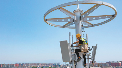 山西省運(yùn)城市加快發(fā)展數(shù)字經(jīng)濟(jì),加大5G網(wǎng)絡(luò)投資建設(shè)力度。圖為技術(shù)人員在運(yùn)城市紅盾花園南5G基站點(diǎn)安裝調(diào)試設(shè)備。