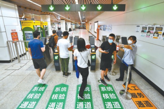 昨天,在地鐵十里河站,乘客從恢復(fù)開放的出入口進(jìn)出站,工作人員在閘機(jī)位置幫助還沒升級(jí)一卡通的乘客進(jìn)行升級(jí)。 本報(bào)記者 鄧偉攝