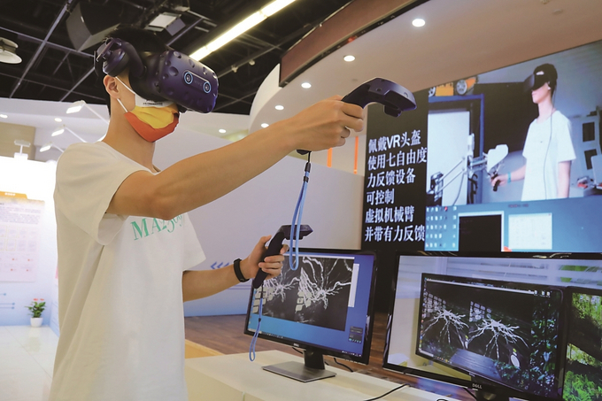 五月二十七日,東南大學(xué)舉辦“科學(xué)名世、人才報(bào)國”教學(xué)科研成果展,圖為現(xiàn)場展示的VR世界里操控虛擬機(jī)械臂。 本報(bào)記者 劉莉 攝