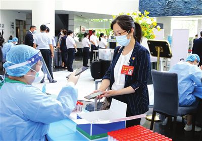 因新冠疫情防控需要,此次黨代會(huì)實(shí)行全程閉環(huán)管理?!罢?qǐng)您先測一下體溫?!惫ぷ魅藛T熱情地引導(dǎo)著。代表們佩戴口罩,保持間距,有序完成測溫、驗(yàn)碼、安檢、流調(diào)、核酸檢測,隨后全身心投入到參會(huì)各項(xiàng)準(zhǔn)備工作。