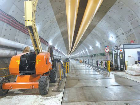 走進項目工地,沒有想象中的機械轟鳴聲,施工現(xiàn)場位于幾十米深的地下。記者從地面乘坐直梯,順著盾構(gòu)機始發(fā)井,來到地下26米處的西線隧道內(nèi)。國產(chǎn)最大直徑泥水平衡盾構(gòu)機“京華號”,已在西線隧道里向前掘進了近4000米。眼前的西線隧道,蜿蜒著向南延伸。開工初期,記者從始發(fā)井步行幾分鐘即可抵達盾構(gòu)機駕駛艙位置;這次采訪,施工方特意安排了1輛純電動代步車?!艾F(xiàn)在盾構(gòu)機離始發(fā)井有些遠,工作人員上下班都得坐車?!瘪{駛員說,這輛電動代步車是用吊車吊到隧道內(nèi)的,還特意為它在隧道里安了充電樁,“這輛車再回到地面,就得是隧道貫通的時候啦!”