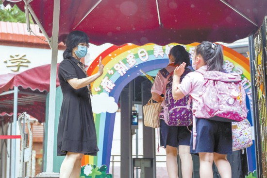 昨天早晨,豐臺區(qū)芳古園小學(xué),因疫情闊別校園多日的小學(xué)生返校復(fù)課,老師在校門口歡迎孩子們歸來。本報(bào)記者 鄧偉攝