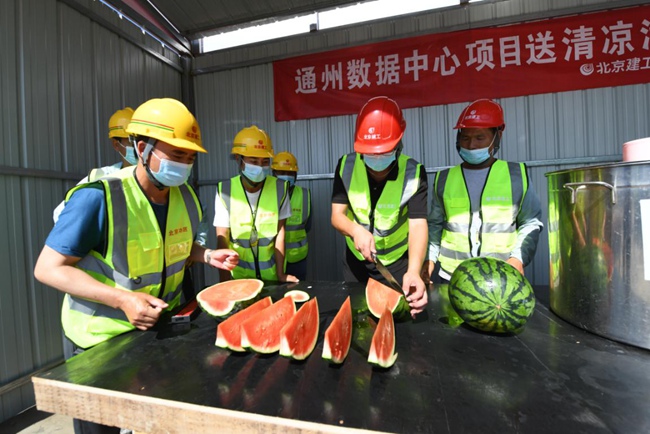 在通州數(shù)據(jù)中心項目頂板鋪設施工現(xiàn)場,高溫對奮戰(zhàn)在施工一線的員工來說無疑是一場巨大的“烤驗”?!半m然現(xiàn)場的溫度達到了38℃,但是項目部合理調(diào)配時間,對現(xiàn)場的防暑降溫工作做了全面部署,施工現(xiàn)場配備了西瓜、綠豆湯、藿香正氣水和清涼油等防暑物資,在場邊設置了遮陽涼棚,并且讓施工人員避開上10點到下午3點的高溫期錯時上崗,保證現(xiàn)場安全生產(chǎn)的同時也盡量不耽誤項目進度?!表椖坎控撠熑撕乐艺f。