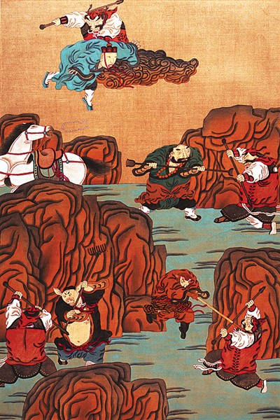 《西游記·車遲國》是周京新“西游”系列中的一幅,描繪了唐僧師徒取經(jīng)路上路過車遲國,與虎力、鹿力、羊力三個妖怪斗法的場景。在他的創(chuàng)作中,中國畫的工筆與寫意并非涇渭分明,體現(xiàn)了“以工養(yǎng)寫”的思考,人物造型緊湊結(jié)實而又不乏詼諧的生趣,山石樹木屋宇乃至黑霧祥云均有裝飾意趣。