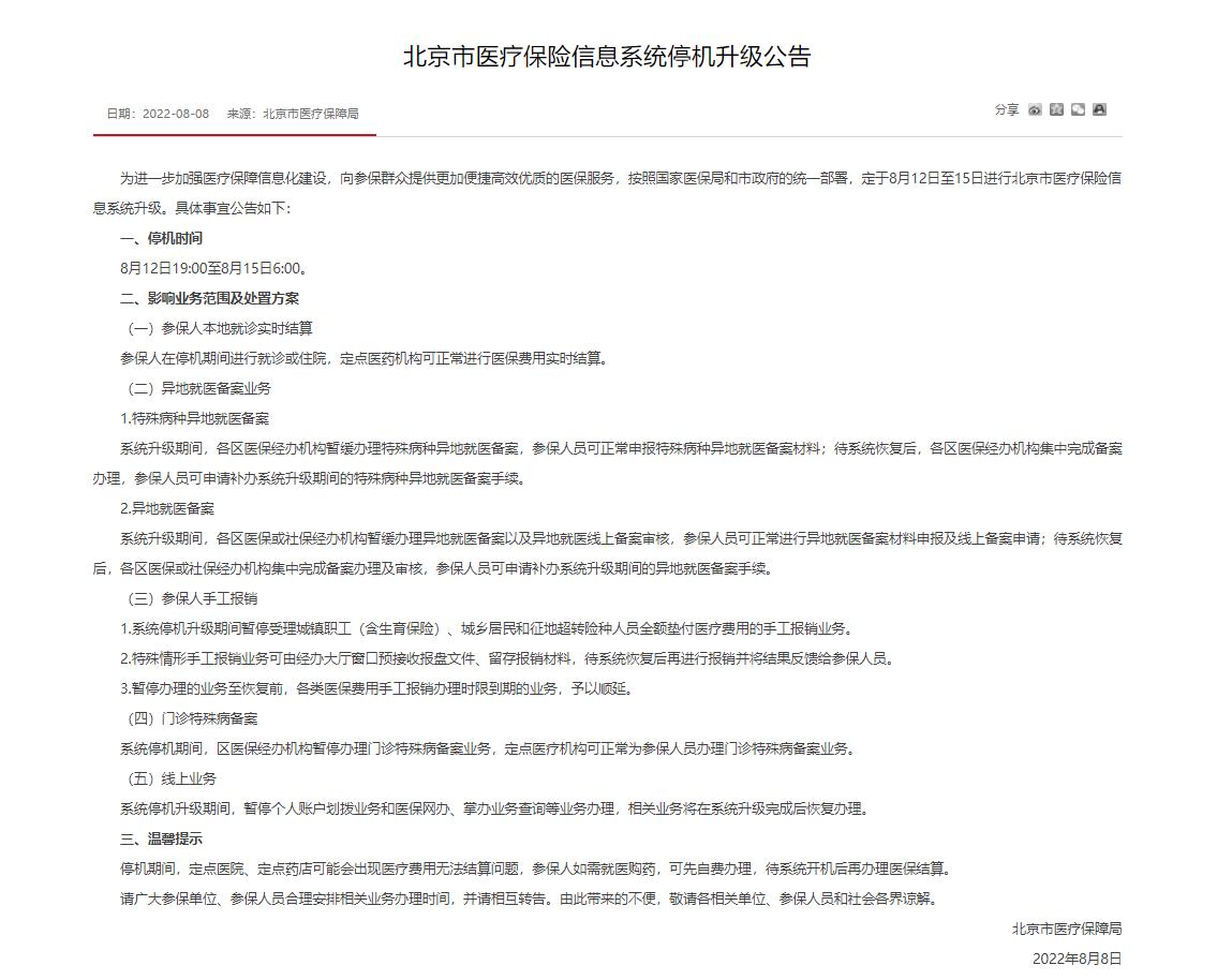 北京醫(yī)保信息系統(tǒng)將停機升級 部分醫(yī)保業(yè)務(wù)暫緩辦理