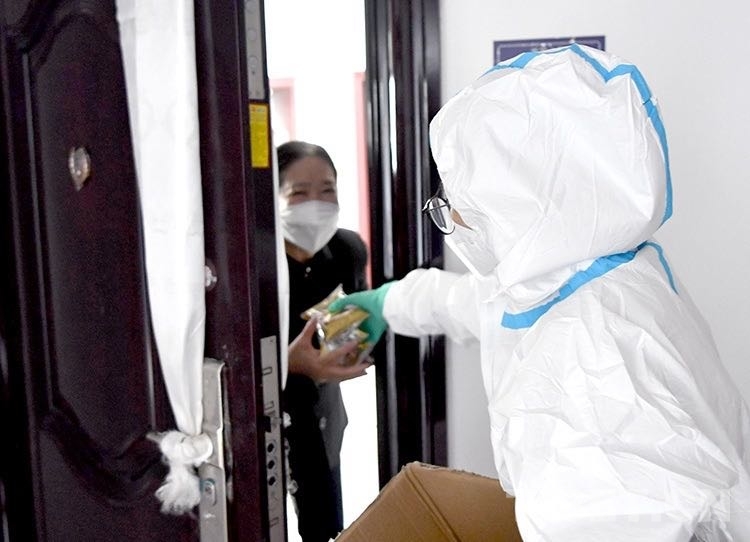 圖為拉薩柳梧新區(qū)一小區(qū)志愿者正在派送月餅 攝影:王媛媛