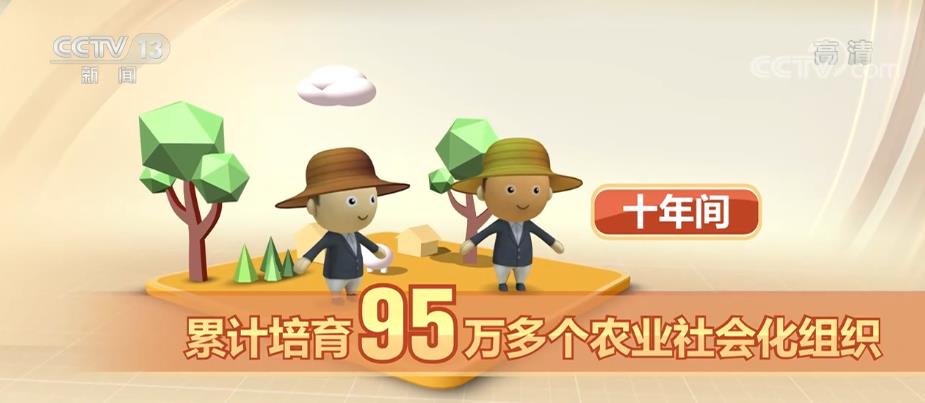 十年間,累計培育95萬多個農(nóng)業(yè)社會化組織,服務面積近17億畝次,服務帶動小農(nóng)超過7800萬戶。全國農(nóng)作物耕種收綜合機械化水平從57%提高到72%以上,水稻、玉米、小麥三大糧食作物機械化率分別超過85%、90%和97%。