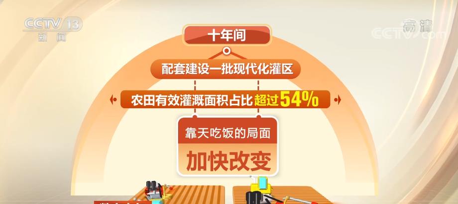 十年間,農(nóng)業(yè)基礎設施明顯改善,累計建成9億畝高標準農(nóng)田,配套建設一批現(xiàn)代化灌區(qū),農(nóng)田有效灌溉面積占比超過54%,靠天吃飯的局面加快改變。