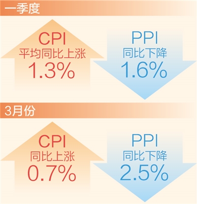 本報(bào)北京4月11日電 (記者劉志強(qiáng))國(guó)家統(tǒng)計(jì)局11日發(fā)布數(shù)據(jù)顯示:3月份,CPI(居民消費(fèi)價(jià)格指數(shù))同比上漲0.7%,漲幅比上月回落0.3個(gè)百分點(diǎn);PPI(工業(yè)生產(chǎn)者出廠價(jià)格指數(shù))同比下降2.5%,降幅比上月擴(kuò)大1.1個(gè)百分點(diǎn)。從一季度看,CPI平均同比上漲1.3%,PPI同比下降1.6%。一季度CPI持續(xù)運(yùn)行在合理區(qū)間,物價(jià)保持平穩(wěn)運(yùn)行,為全年物價(jià)穩(wěn)定奠定了堅(jiān)實(shí)基礎(chǔ)。
