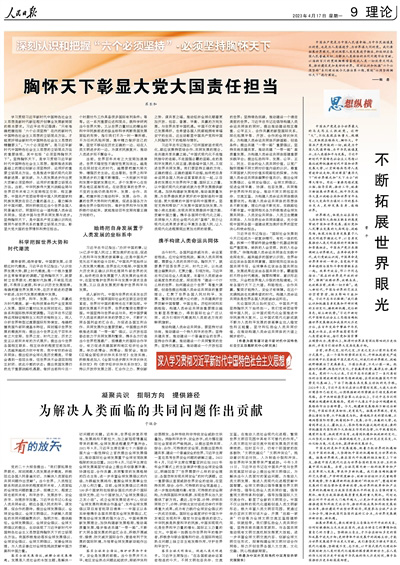 中國共產(chǎn)黨是為中國人民謀幸福、為中華民族謀復(fù)興的黨,也是為人類謀進(jìn)步、為世界謀大同的黨。我們要拓展世界眼光,深刻洞察人類發(fā)展進(jìn)步潮流,積極回應(yīng)各國人民普遍關(guān)切,為解決人類面臨的共同問題作出貢獻(xiàn),以海納百川的寬闊胸襟借鑒吸收人類一切優(yōu)秀文明成果,推動(dòng)建設(shè)更加美好的世界。深刻認(rèn)識(shí)和把握“六個(gè)必須堅(jiān)持”系列理論版今天推出第六期,圍繞“必須堅(jiān)持胸懷天下”進(jìn)行闡述。