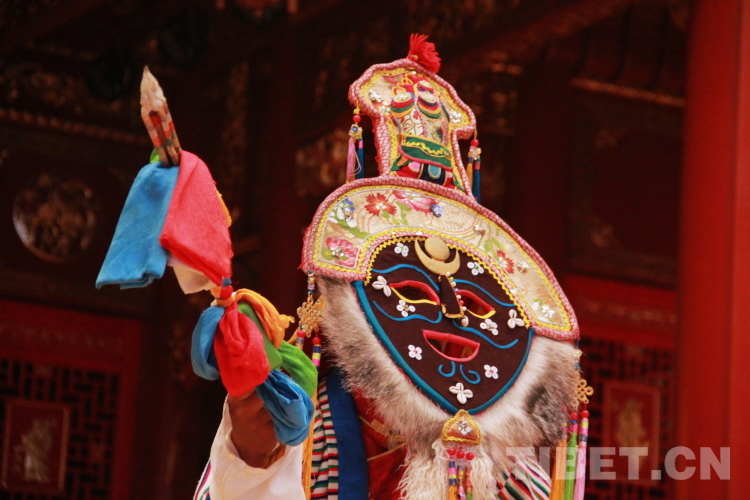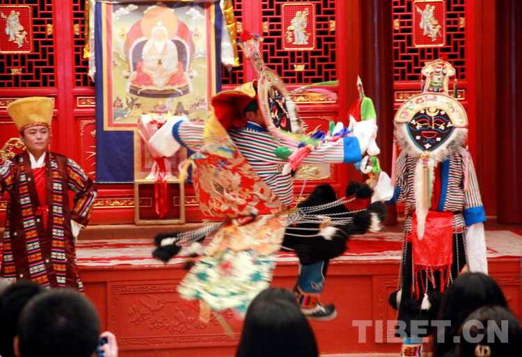 圖為拉薩市城關(guān)區(qū)娘熱民間藝術(shù)團演員表演國家級非物質(zhì)文化遺產(chǎn)“堆諧”攝影:劉莉