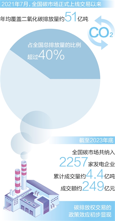 2021年7月全國碳市場正式上線交易以來,運(yùn)行整體平穩(wěn),年均覆蓋二氧化碳排放量約51億噸,占全國總排放量的比例超過40%。截至2023年底,全國碳市場共納入2257家發(fā)電企業(yè),累計成交量約4.4億噸,成交額約249億元,碳排放權(quán)交易的政策效應(yīng)初步顯現(xiàn)。