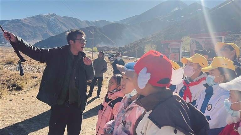 小朋友們?cè)诒Wo(hù)中心工作人員李義旺的帶領(lǐng)下了解雪豹生存環(huán)境。