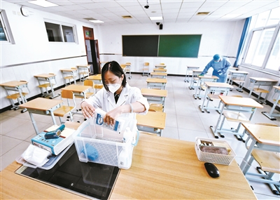 圖為工作人員對(duì)教室進(jìn)行清潔和消毒。攝影/本報(bào)記者 郝羿