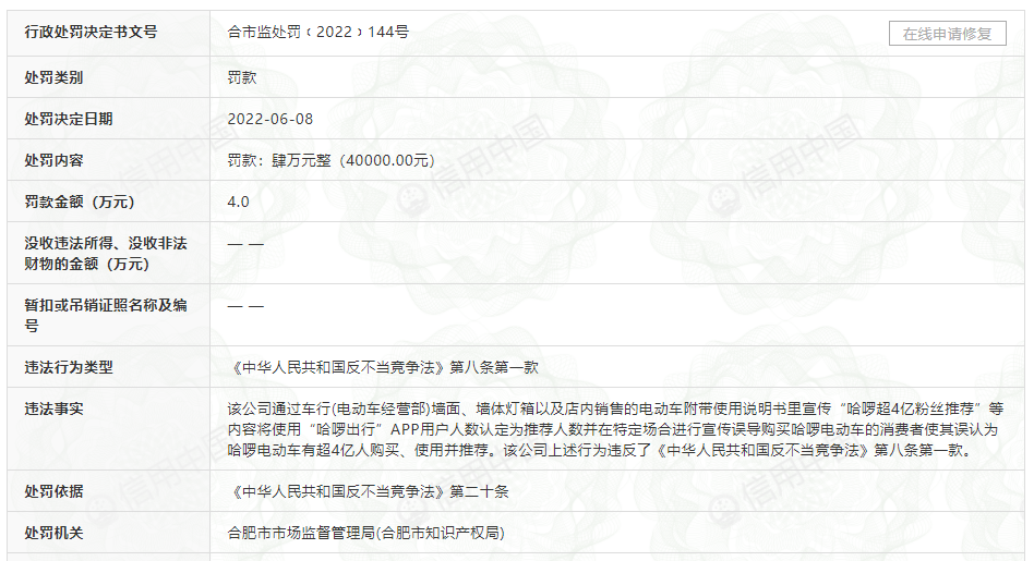 哈啰關聯(lián)公司因誤導消費者被罰4萬元:宣稱超4億粉絲推薦