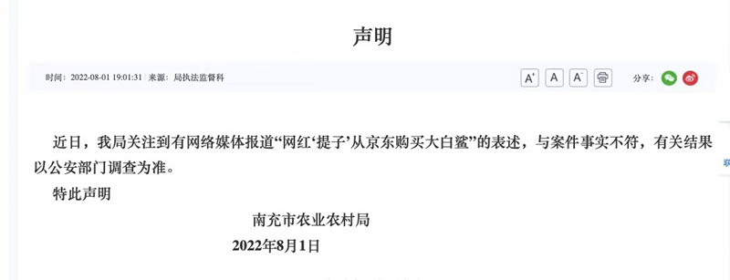 事件被越來越多人關(guān)注,公安部門已經(jīng)介入。平臺地址顯示“提子”位于四川南充,當(dāng)?shù)剞r(nóng)業(yè)農(nóng)村局的工作人員2日下午向記者證實,已將涉事鯊魚送往鑒定機構(gòu)。“我們之前執(zhí)法監(jiān)督科送檢了一部分,這個案件現(xiàn)在是刑事案件,公安機關(guān)在這邊處理?!?/p>