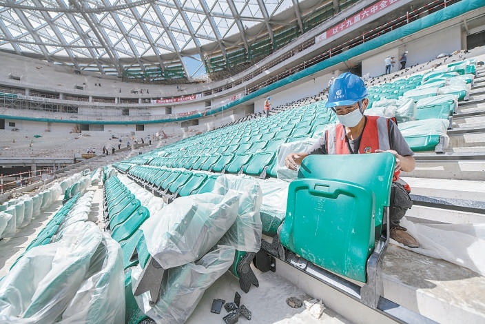 在新工體壯觀的鋼罩棚之下,一張張嶄新的“國槐綠”座椅被安裝到位。本報記者 潘之望攝
