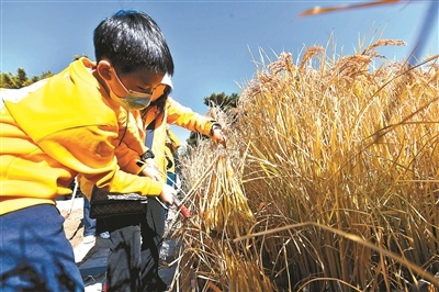 昨天上午,北京青年報(bào)記者來到先農(nóng)壇,觀耕臺(tái)前的一畝三分地上,水稻已經(jīng)成熟,稻穗在陽光下隨風(fēng)搖曳,煥發(fā)出金燦燦的光澤,構(gòu)成獨(dú)特的古都秋景。隨著主持人開鑼、小朋友們齊喊“豐收嘍”,收割儀式正式開始。在場(chǎng)嘉賓和10名小朋友一起收割第一鐮新稻子,寓意豐收碩果新開始。