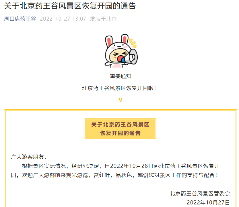 央廣網(wǎng)北京10月27日消息 據(jù)周口店藥王谷微信號(hào)消息,根據(jù)景區(qū)實(shí)際情況,經(jīng)研究決定,自2022年10月28日起北京藥王谷風(fēng)景區(qū)恢復(fù)開園。歡迎廣大游客前來觀光游覽,賞紅葉,品秋色。