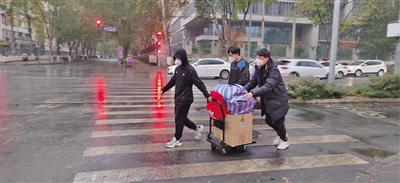 學(xué)校進入臨時管控狀態(tài),但很多學(xué)生人在住宿區(qū)、學(xué)習(xí)物品在北校園的學(xué)習(xí)區(qū),怎么辦?該校通過接訴即辦平臺收到學(xué)生的反映后,立即作出決策,成立物品傳遞轉(zhuǎn)運隊伍,幫助學(xué)生解決人與學(xué)習(xí)物品分離的問題,學(xué)院書記、院長和師生志愿者立即行動起來組建搬運隊伍,有的在校內(nèi)幫忙打包學(xué)生物資,有的在校外接應(yīng)、及時將學(xué)生所需物資送到學(xué)生手里。