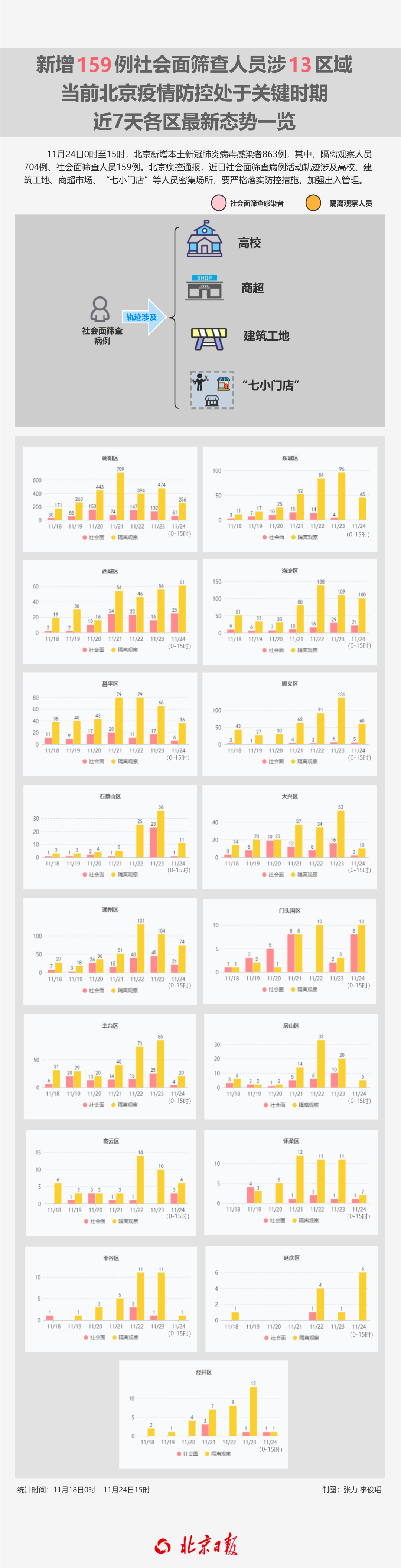 11月24日0時(shí)至15時(shí),北京新增本土新冠肺炎病毒感染者863例,其中,隔離觀察人員704例、社會面篩查人員159例;朝陽區(qū)317例,海淀區(qū)121例,通州區(qū)95例,西城區(qū)86例,順義區(qū)65例,東城區(qū)45例,昌平區(qū)42例,豐臺區(qū)24例,門頭溝區(qū)18例,石景山區(qū)、大興區(qū)各12例,密云區(qū)9例,延慶區(qū)6例,房山區(qū)5例,懷柔區(qū)3例,經(jīng)開區(qū)2例,平谷區(qū)1例;重型3例、普通型2例、輕型164例、無癥狀感染者694例。