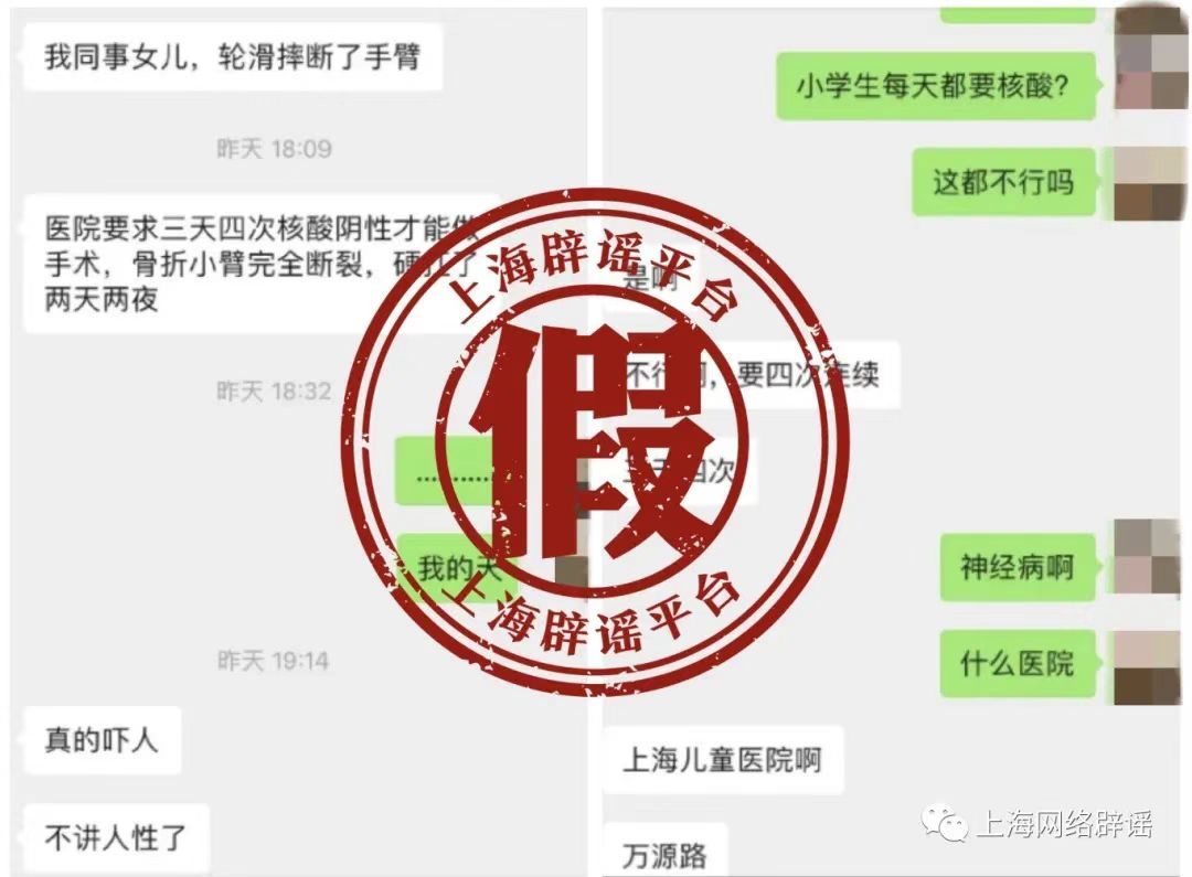 “上海一醫(yī)院要求兒童三天四次核酸才能做手術(shù),孩子骨折小臂斷裂,硬抗了兩天兩夜?!辈痪们?,一條聊天記錄在陸先生的家屬群引發(fā)熱議。因為表姐一家生活在上海,親戚還特意提醒她照顧好孩子。而很快,官方發(fā)布辟謠消息,稱經(jīng)過多路求證,聊天記錄中所指醫(yī)院并沒有三天四次核酸檢測陰性才能手術(shù)的要求,院方也未核查到存在所傳相似情況的病人。