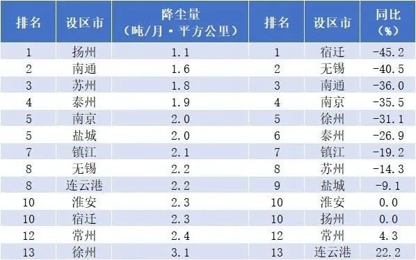 降塵量改善幅度由好到差依次排序為:宿遷、無錫、南通、南京、徐州、泰州、鎮(zhèn)江、蘇州、鹽城、淮安(揚(yáng)州并列)、常州、連云港。