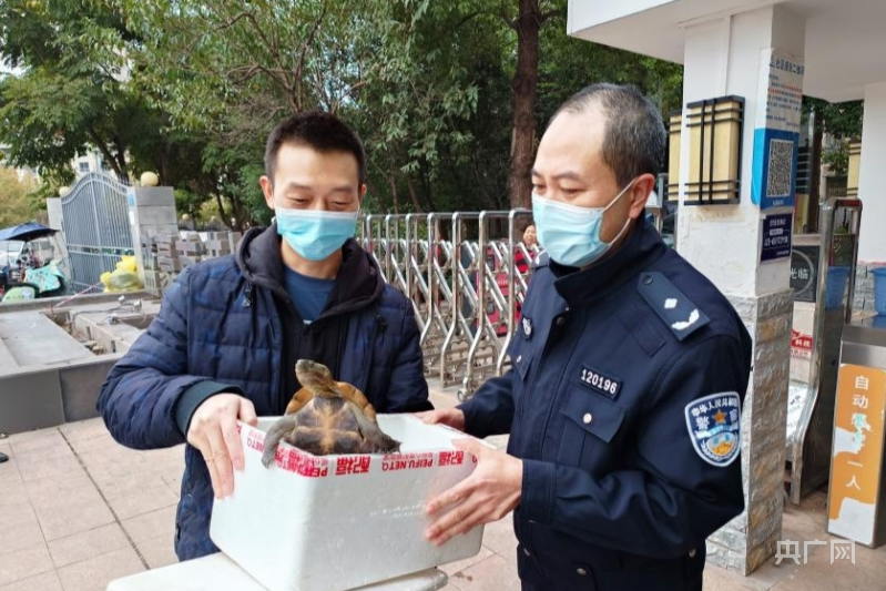 “警察同志您好,我這兒撿了一只烏龜,上網查了一下應該是國家二級保護動物,麻煩你們幫忙看看?!?2月4日,群眾魏先生將撿到的一只烏龜交到了重慶高新區(qū)公安分局食藥環(huán)偵支隊民警的手中。