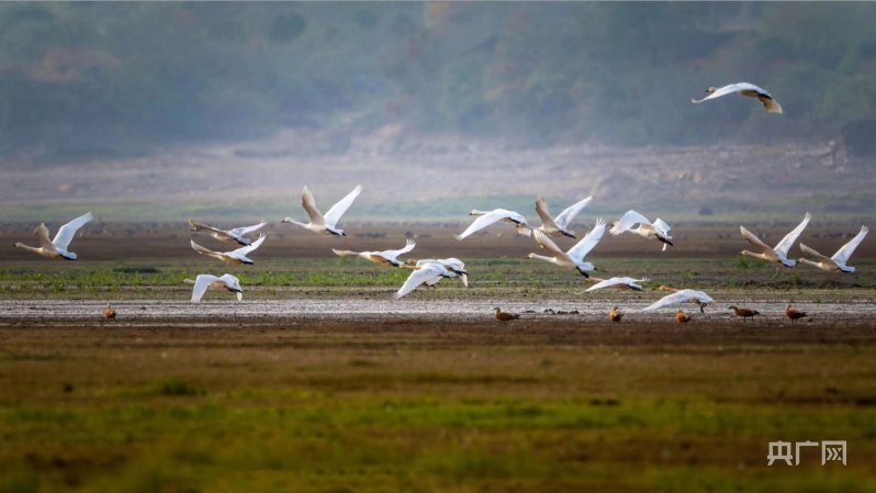 央廣網都昌12月29日消息(記者鄧玉玲)元旦前夕,在江西鄱陽湖都昌大沔池水域,數百只小天鵝自由自在地徜徉于湖畔淺灘。