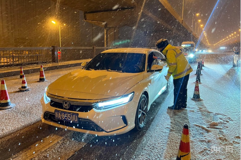 新疆烏魯木齊市水磨溝區(qū)交警大隊(duì)民警正在引導(dǎo)車輛有序通行(央廣網(wǎng)發(fā) 烏魯木齊市水磨溝區(qū)交警大隊(duì) 供圖)