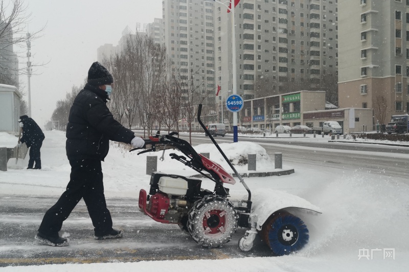 在新疆烏魯木齊市,工作人員正在清理道路積雪(央廣網(wǎng)記者羅成 攝)