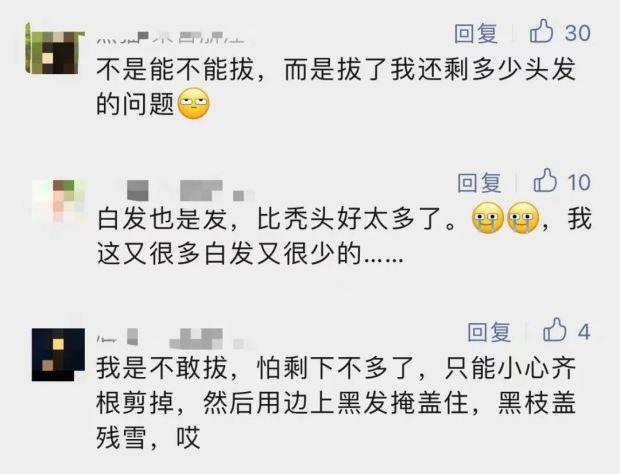 一些人在壓力較大時(shí),可能會將疼痛感轉(zhuǎn)化為某種獲得感,在一定程度上緩解焦慮。但更多人是從拔白頭發(fā)這件事當(dāng)中獲得一種視覺上的自信——似乎又回到了頭發(fā)烏黑的時(shí)代。