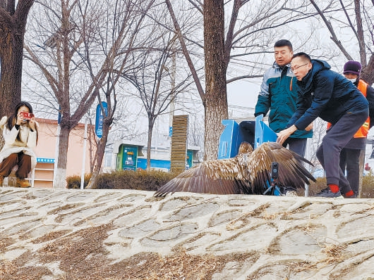 “哇!”箱門打開,白尾海雕撲扇幾下翅膀沖出箱子振翅高飛,圍觀人群發(fā)出一陣驚嘆。2月17日下午2時,北京市野生動物救護中心、懷柔區(qū)園林綠化局野生動植物保護管理中心10余名工作人員來到懷柔鎮(zhèn)紅軍莊村懷沙河段,將此前受傷獲救現(xiàn)已痊愈的白尾海雕放歸自然。