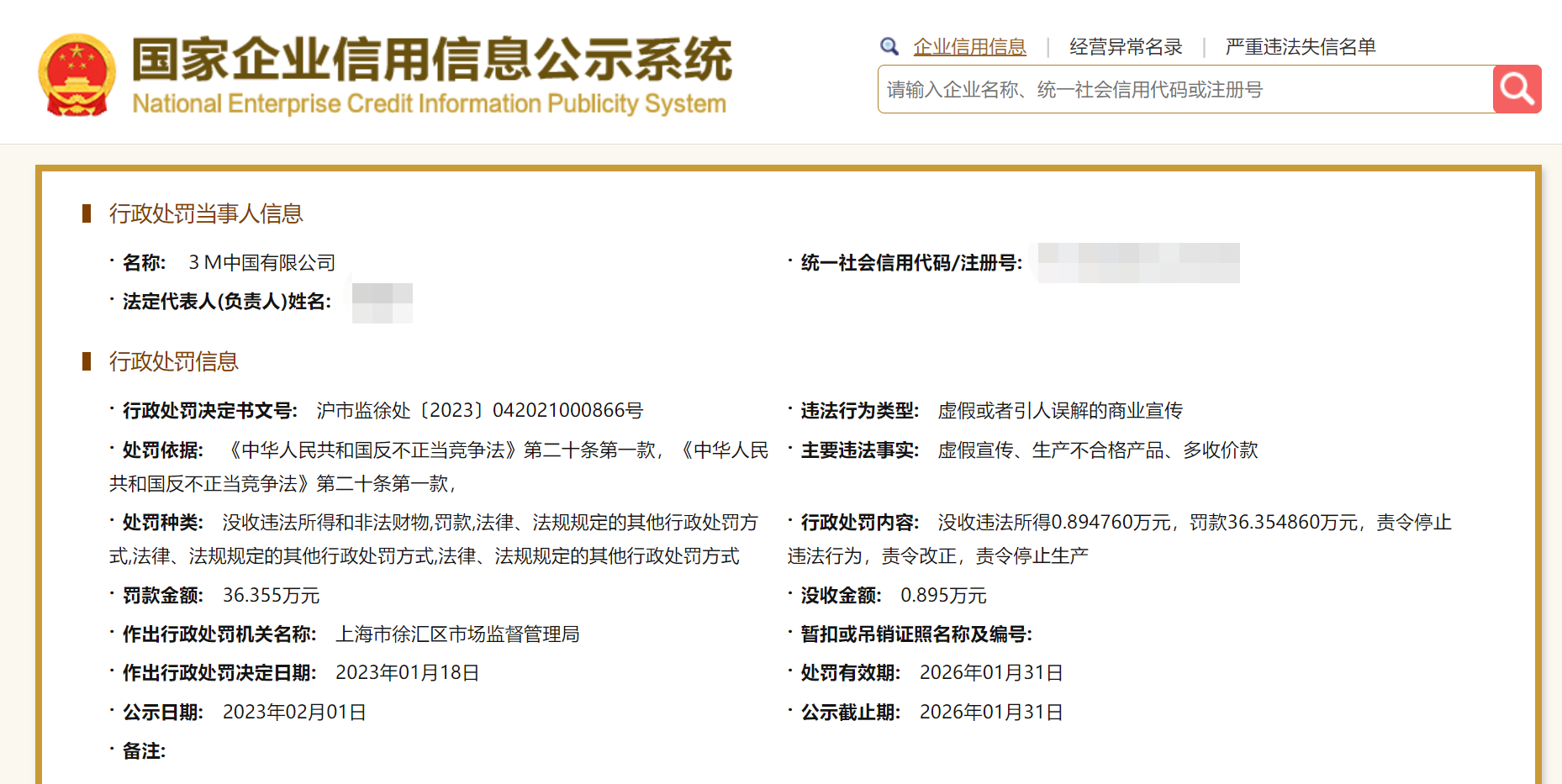行政處罰信息顯示,3M中國主要違法事實(shí)為虛假宣傳、生產(chǎn)不合格產(chǎn)品、多收價(jià)款。