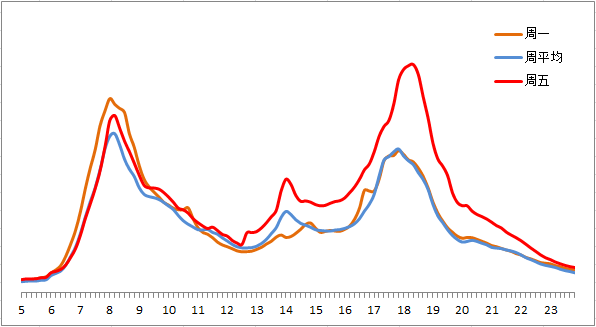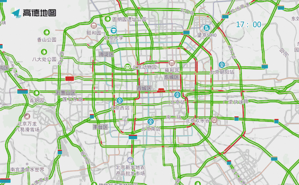晚高峰期間,東、西、北二、三、四、五環(huán),東六環(huán)部分路段,以及萬(wàn)泉河路至圓明園西路、通惠河北路、蓮石東路等城區(qū)道路出城方向車(chē)流集中,京藏高速、京承高速、京通快速、京港澳高速、機(jī)場(chǎng)高速等高速公路出京方向?qū)⒊霈F(xiàn)高峰車(chē)流,高峰時(shí)段為17:00—19:00,周五晚高峰提前且持續(xù)時(shí)間較長(zhǎng)。