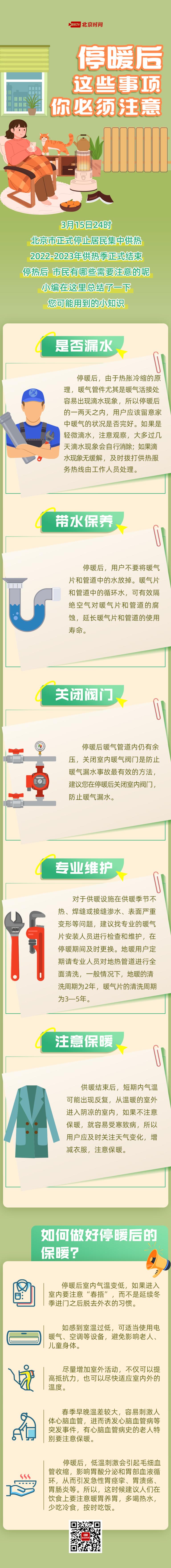 今日(16日)起,北京市正式停止居民集中供熱,都有哪些注意事項(xiàng)?首先要做好供熱設(shè)備的維護(hù),包括及時(shí)檢測(cè)暖氣管道是否漏水,不要放掉暖氣管道中的水,停暖后及時(shí)關(guān)閉室內(nèi)閥門(mén)并安排專(zhuān)業(yè)人員對(duì)供暖設(shè)施進(jìn)行維護(hù)和清洗。在停暖后還需注意保暖,如注意“春捂”,增加室外活動(dòng),注重心血管和腸胃的保暖,避免早晚溫差刺激。停暖知識(shí)帖來(lái)了,戳圖了解→