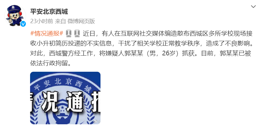 央廣網(wǎng)北京4月3日消息 據(jù)北京市公安局西城分局官方微博平安北京西城消息,近日,有人在互聯(lián)網(wǎng)社交媒體編造散布西城區(qū)多所學(xué)?,F(xiàn)場接收小升初簡歷投遞的不實(shí)信息,干擾了相關(guān)學(xué)校正常教學(xué)秩序,造成了不良影響。