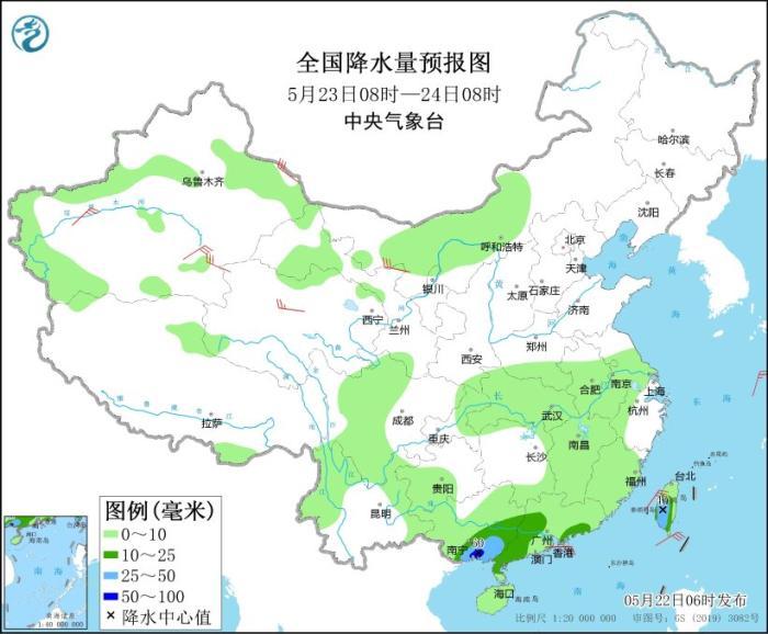 5月23日08時(shí)至24日08時(shí),華南南部、臺(tái)灣島等地部分地區(qū)有中到大雨,其中,廣西東南部沿海等地部分地區(qū)有暴雨(50~60毫米)。新疆南疆盆地、青海北部、甘肅河西等地部分地區(qū)有4~6級(jí)風(fēng)。東海大部海域、臺(tái)灣海峽、臺(tái)灣以東洋面將有6~7級(jí)、陣風(fēng)8~9級(jí)的風(fēng)。