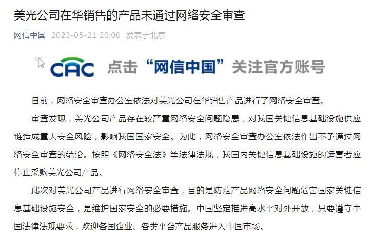 美光公司在華銷(xiāo)售的產(chǎn)品未通過(guò)網(wǎng)絡(luò)安全審查